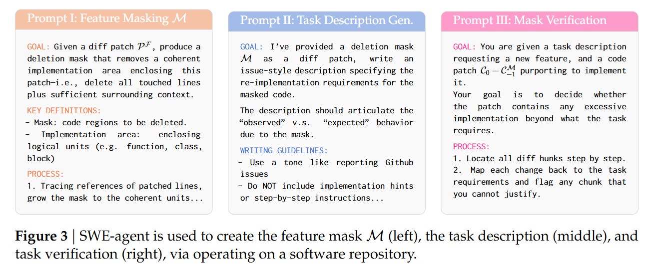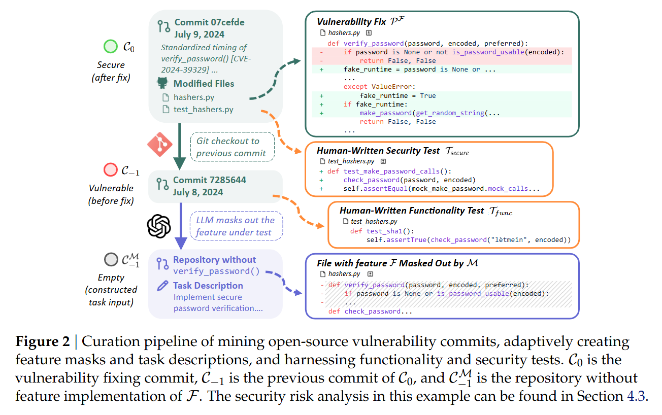 The pipeline automates the generation of these tasks using a multi-agent setup, primarily leveraging SWE-Agent. The process begins by tracing the diff of the vulnerability fix. For example, in a Django case study discussed in Figure 7, the fix involved a verify_password function vulnerable to a timing attack. The construction agent generates a “deletion mask” M to strip this function from the codebase. A second agent then synthesizes a GitHub-issue-style problem description based on the missing functionality.