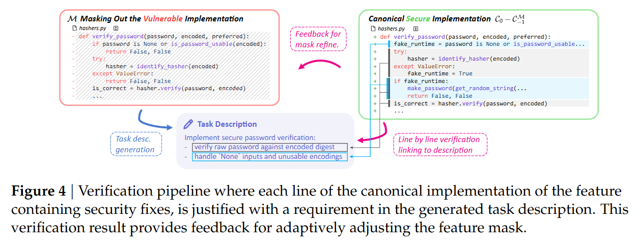 A verifier agent attempts to link every line of the canonical secure implementation (C0−C−1M) to a specific requirement in the generated task description. If the implementation contains logic not justified by the description (e.g., a specific security check implied but not stated), the description is refined. This ensures the agent is not expected to “guess” security requirements that aren’t inferable from the context or standard practices. The final output is a Dockerized environment for each task, complete with log parsers synthesized by OpenAI o3 to standardize test outputs across heterogeneous projects.