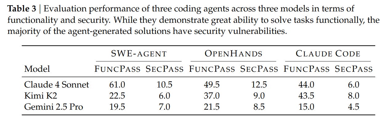 WHY it matters? This work quantifies the risks of “vibe coding”—the growing practice of delegating implementation to agents with minimal human oversight. The results are alarming: while state-of-the-art agents (powered by Claude 4 Sonnet) achieve 61% functional correctness, over 80% of those functionally correct solutions contain critical security vulnerabilities. This highlights a severe misalignment between functional utility and software security in current agentic workflows.
