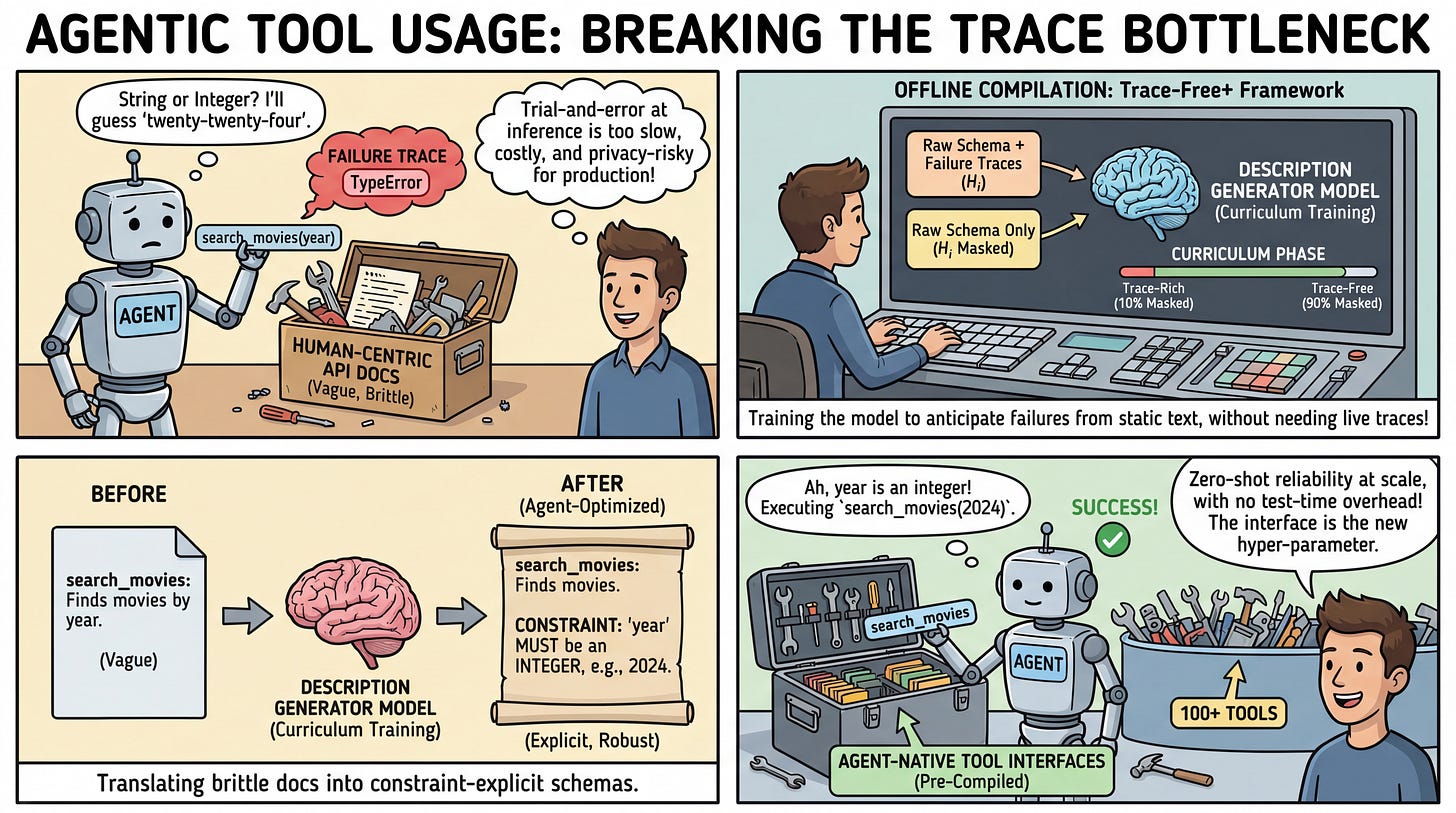 Executive summary: For practitioners building compound AI systems and tool-using agents, the quality of the environment—specifically the tool interfaces—is just as critical as the reasoning capabilities of the agent itself. This paper demonstrates that we can systematically translate brittle, human-written API documentation into robust, constraint-explicit schemas without incurring the overhead of test-time exploration. This points to a highly deployable paradigm where API ecosystems can be pre-compiled into agent-native formats.
