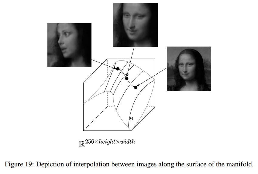 Traversing this manifold allows for meaningful interpolation, unlike linear interpolation in the ambient pixel space (Figure 19).