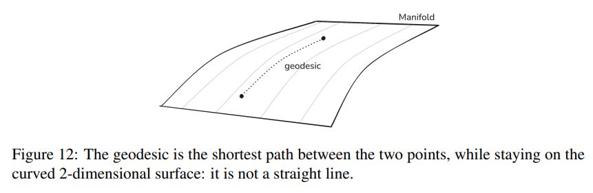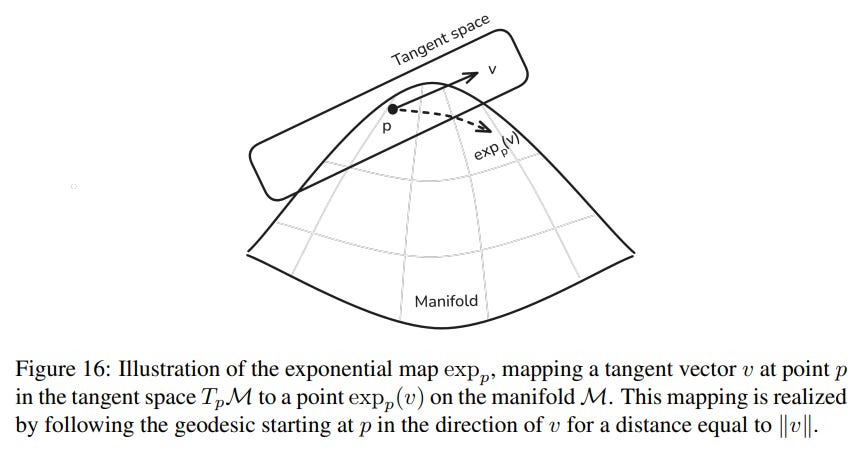 Tools from differential geometry, like geodesics (the shortest path on a manifold, Figure 12) and the exponential map (Figure 16), allow us to perform calculations in locally flat tangent spaces and project the results back onto the manifold.