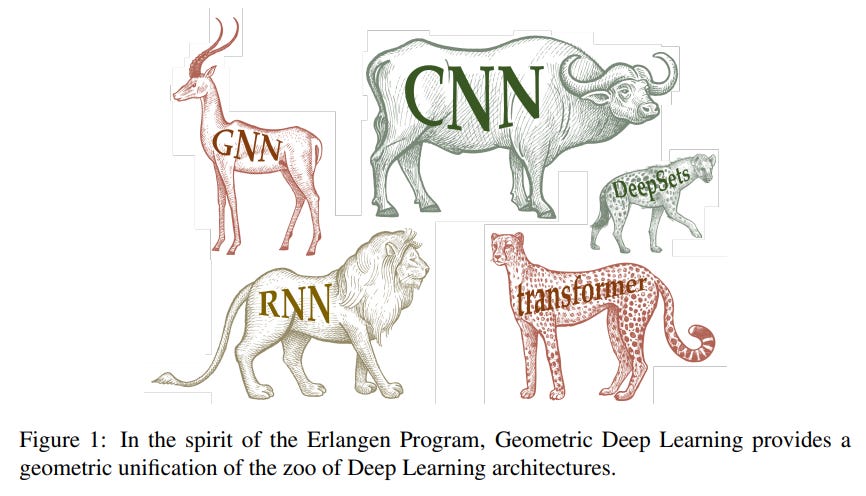 This paper serves as a masterclass in the principles underlying this paradigm shift. It is not a typical research paper presenting a novel algorithm, but rather a meticulously crafted educational resource. The authors argue that many successful deep learning architectures can be seen as specific instances of a more general, geometric framework (Figure 1), and by understanding the underlying mathematical language, we can move from empirical design to a more principled, unified approach.