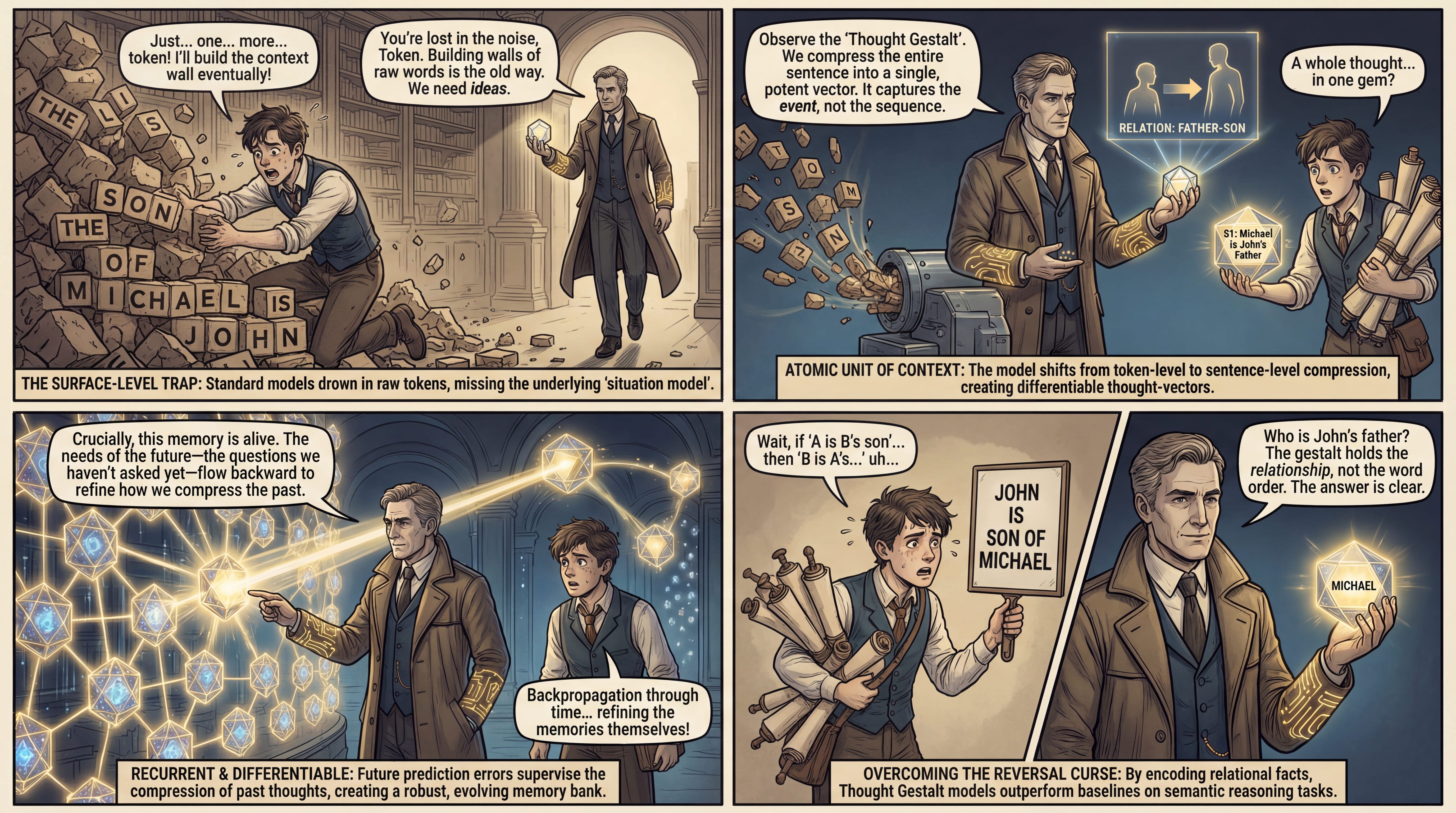 WHAT was done? The authors introduce the Thought Gestalt (TG) model, a recurrent Transformer architecture that processes text one sentence at a time. Instead of maintaining a full history of past tokens (KV-cache), TG compresses each processed sentence into a single vector representation—a “gestalt”—which is stored in a differentiable memory. Crucially, the model is trained end-to-end; gradients from future token predictions flow backward through the memory to optimize the parameters that generated earlier sentence representations.