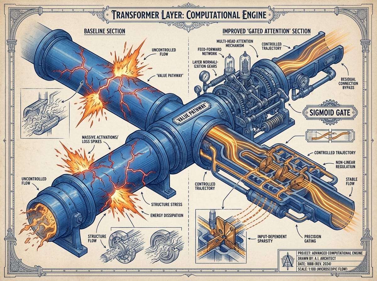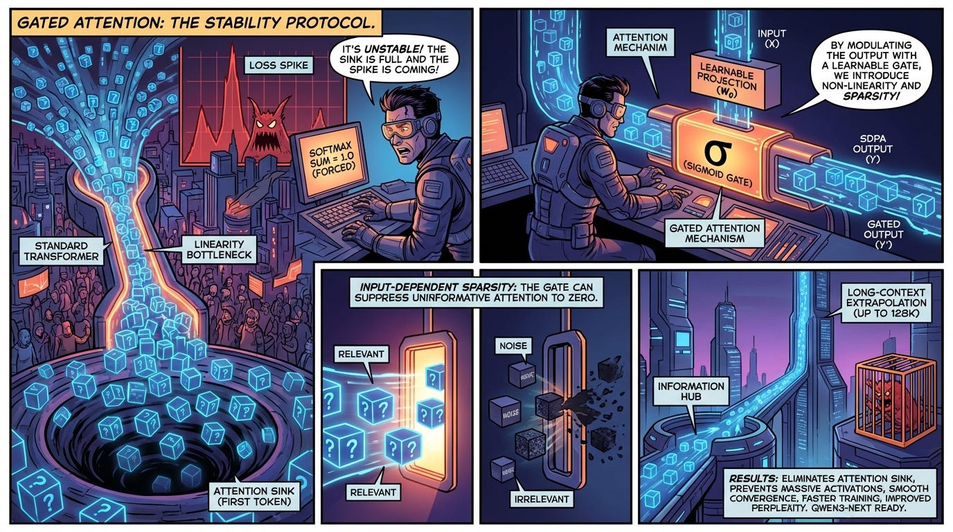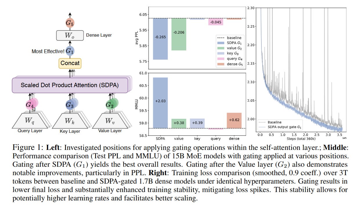 WHY it matters? This simple architectural modification yields profound stability improvements for large-scale training (eliminating loss spikes) and consistently improves perplexity on 15B MoE and 1.7B dense models. Crucially, it mechanistically eliminates the “Attention Sink” phenomenon and “Massive Activations” without requiring heuristic fixes like “sink tokens,” thereby significantly improving long-context extrapolation.