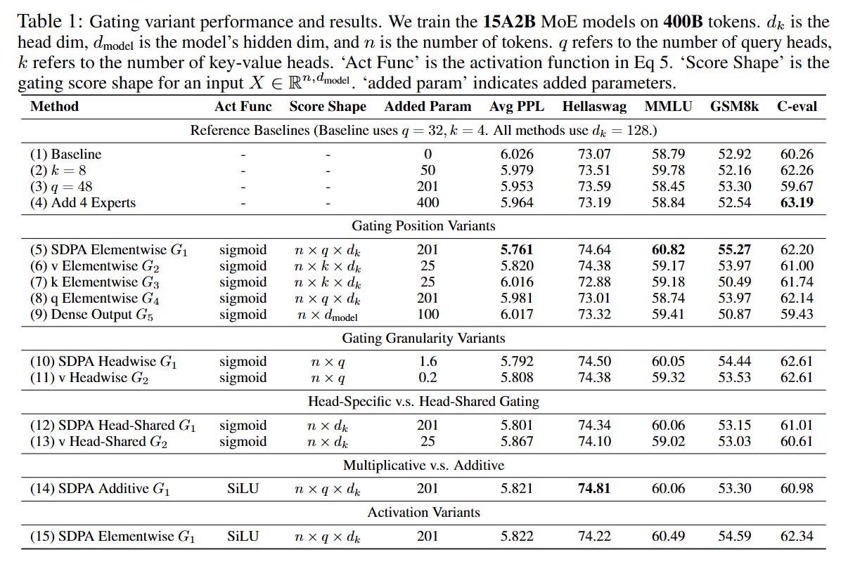 Here, Y∈Rn×d is the output of the SDPA, ⊙ represents element-wise multiplication, and σ is the sigmoid activation function. The term XWθ represents a learnable linear projection of the input X into a gating score. While the authors experimented with various positions (gating Values, Keys, or the final Dense output), they identified that element-wise, head-specific gating applied specifically to the SDPA output yields the optimal balance of performance and parameter efficiency.