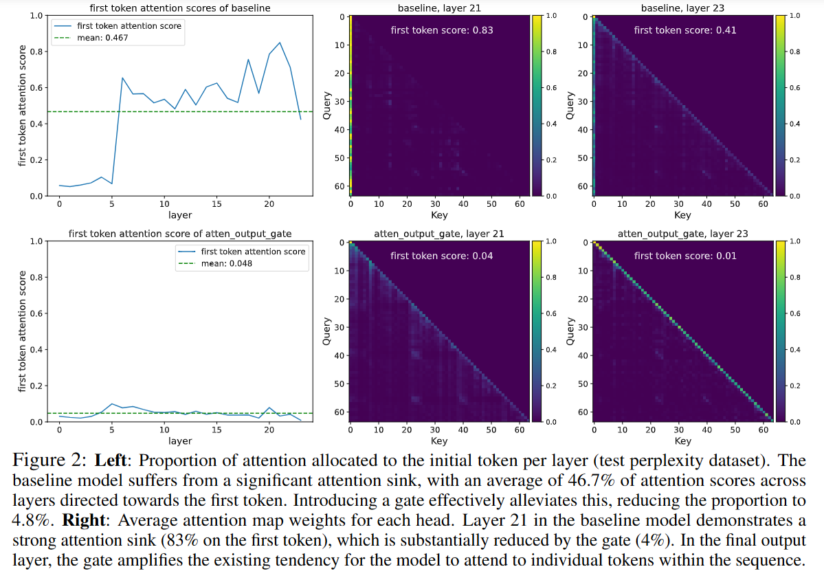 In standard models, specific channels in the hidden states accumulate massive values (outliers), and the model attends heavily to the first token to manage the Softmax distribution. The authors show in Figure 2 that while baselines allocate ~46.7% of attention to the first token, Gated Attention models reduce this to ~4.8%.