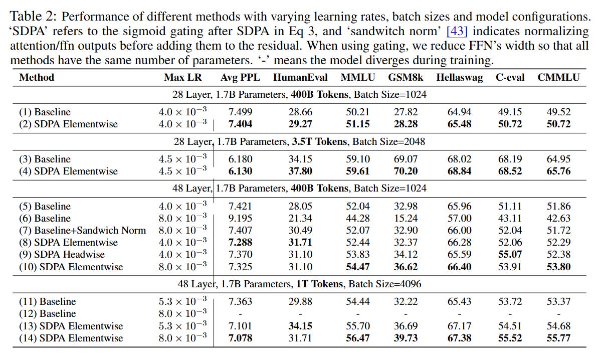 As illustrated in the loss curves (Figure 1, Right), baseline models frequently suffer from loss spikes—sudden divergences that require restarting training or rolling back checkpoints. The Gated Attention models exhibit smooth convergence curves. This stability allows for the use of larger learning rates (e.g., increasing max LR from 4.0×10−3 to 4.5×10−3), which in turn facilitates faster convergence and better final scaling laws. The computational overhead is negligible (less than 2% wall-time latency) because the gating operation introduces minimal FLOPs compared to the quadratic cost of attention or the massive matrices of the FFN.