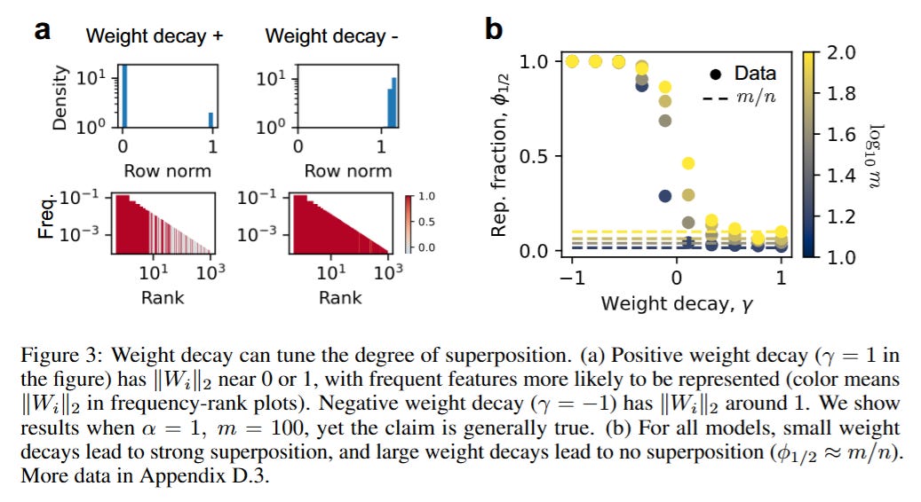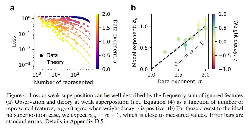 The transition between these regimes fundamentally alters the scaling behavior. As illustrated in Figure 4, when the model is in weak superposition, the loss is dominated by the summed frequency of the unrepresented features. Consequently, the scaling law depends entirely on the data distribution; if feature frequencies decay as pi∝1/iα, the loss scales as L∝m−(α−1). This regime is fragile and data-dependent.