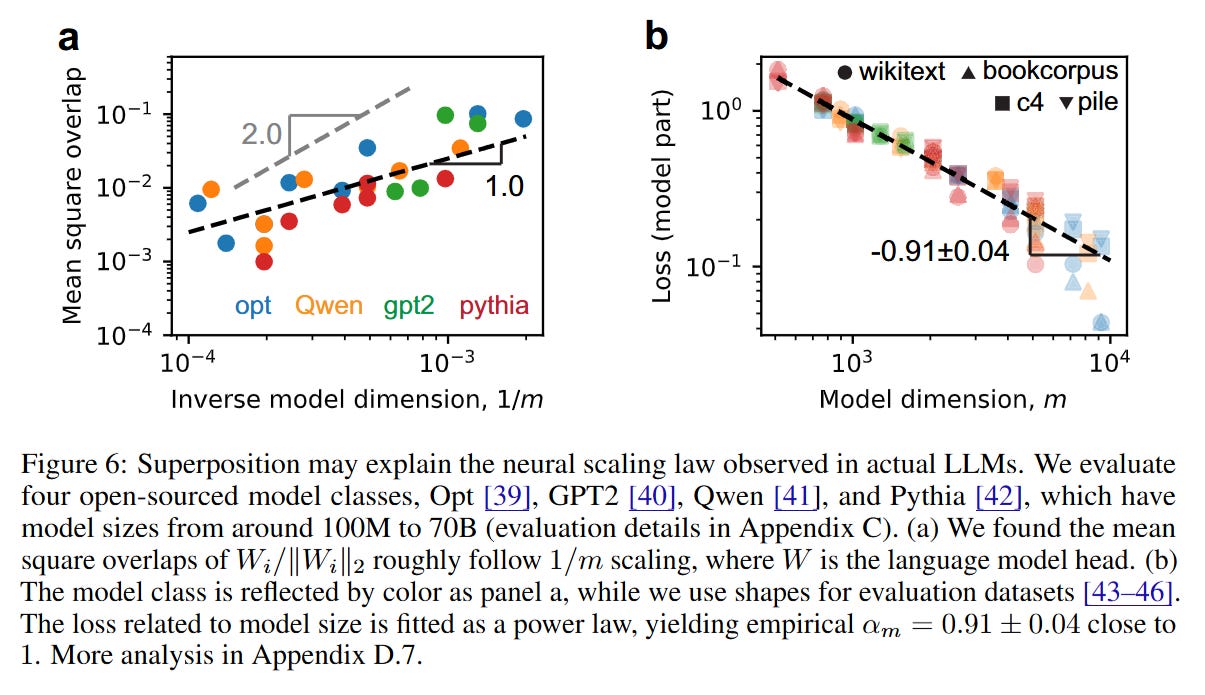 Furthermore, when fitting the loss of these models against their width, the authors extract an empirical exponent αm≈0.91±0.04, which is strikingly close to the theoretical prediction of 1.0 derived from the geometry of strong superposition. This suggests that modern LLMs are indeed operating in a regime where performance is limited by the geometric interference of packing too many token representations into a fixed-width vector space.