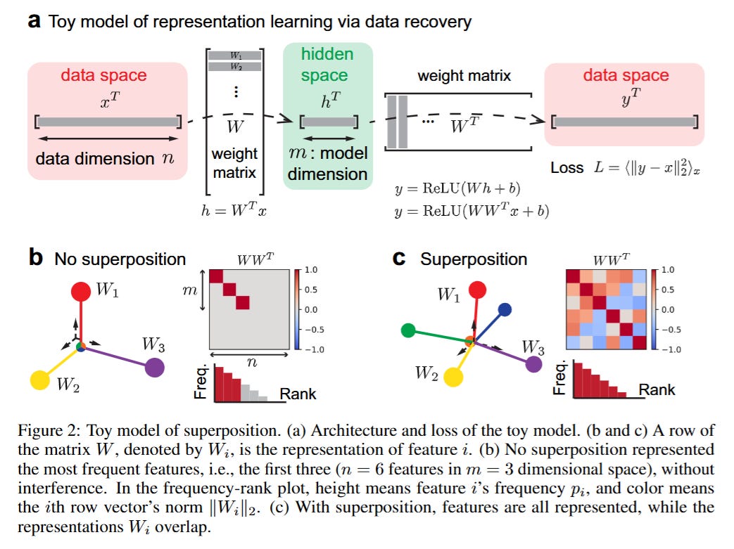To isolate the mechanics of scaling, the authors adapt the Toy Models of Superposition framework popularized by Anthropic. The core theoretical object is the feature vector x∈Rn, which is sparse. The model projects this high-dimensional input into a lower-dimensional hidden state h∈Rm (where m≪n) via a weight matrix W, attempting to recover it. The input features are modeled as xi=uivi, where ui determines sparsity and vi determines magnitude. The critical tension arises from the bottleneck: the model must compress n potential features into m dimensions.