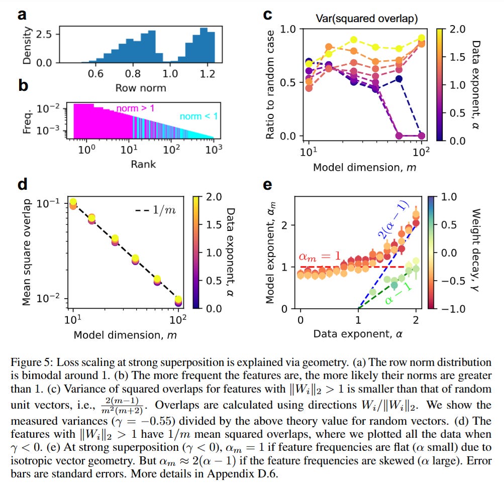 However, the authors demonstrate a phase transition into Strong Superposition when weight decay is reduced. Here, the model learns an overcomplete basis. The researchers show that the representation vectors tend to arrange themselves into an Equiangular Tight Frame (ETF) or an ETF-like structure, maximizing the angle between vectors to minimize interference. In this regime, the squared overlap between any two feature vectors scales inversely with the dimension, roughly following ⟨(Wi⋅Wj)2⟩∝1/m. Because the reconstruction error in the toy model is driven by these interference terms, the loss becomes robustly proportional to 1/m, or L∝m−1. This leads to the critical insight shown in Figure 5: in strong superposition, the scaling law becomes “universal” and largely independent of the specific skewness of the data distribution.