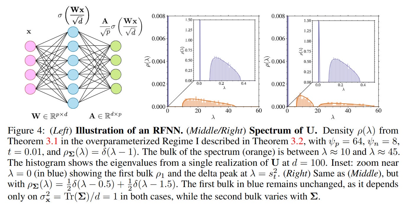 The authors substantiate the empirical scaling laws with a formal derivation in the asymptotic limit where d,p,n→∞. They utilize the Sokhotski–Plemelj inversion formula to recover the eigenvalue density ρ(λ) of the correlation matrix U. The theoretical analysis in Figure 4 confirms that the spectrum is split into two disjoint supports in the overparameterized regime (p≫n). The first support (bulk) is associated with the population covariance and dictates τgen. The second support is associated with the finite sampling noise.