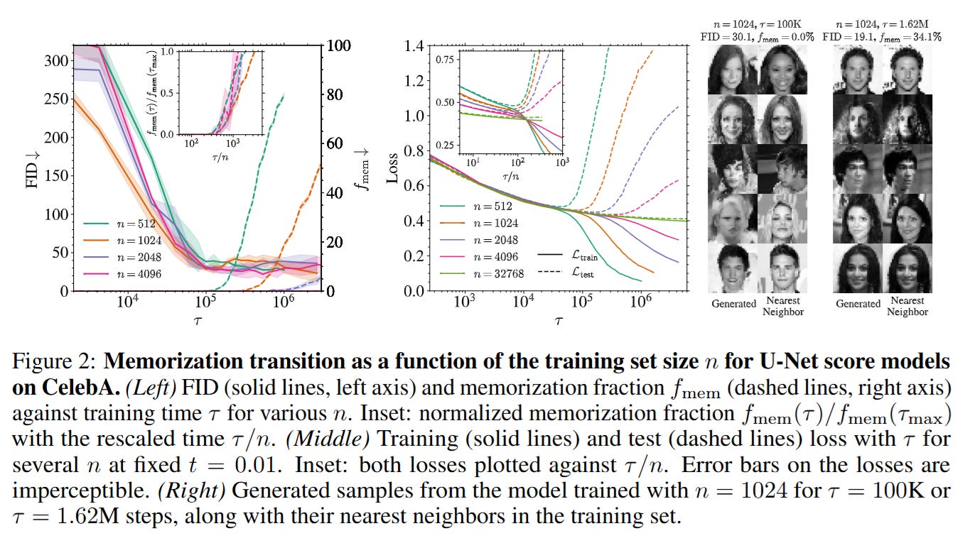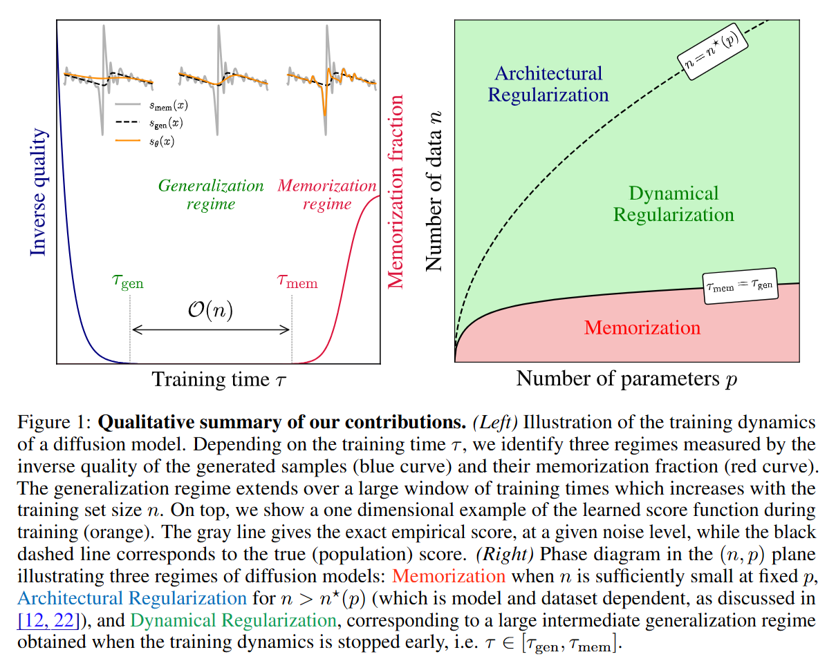 WHAT was done? The authors provide a theoretical and empirical analysis characterizing the training dynamics of score-based diffusion models. Recognizing that models can eventually overfit, they identify two distinct timescales: τgen, when the model learns to generate valid samples, and τmem, when it begins to memorize specific training instances. This work was awarded a Best Paper Award at NeurIPS 2025.