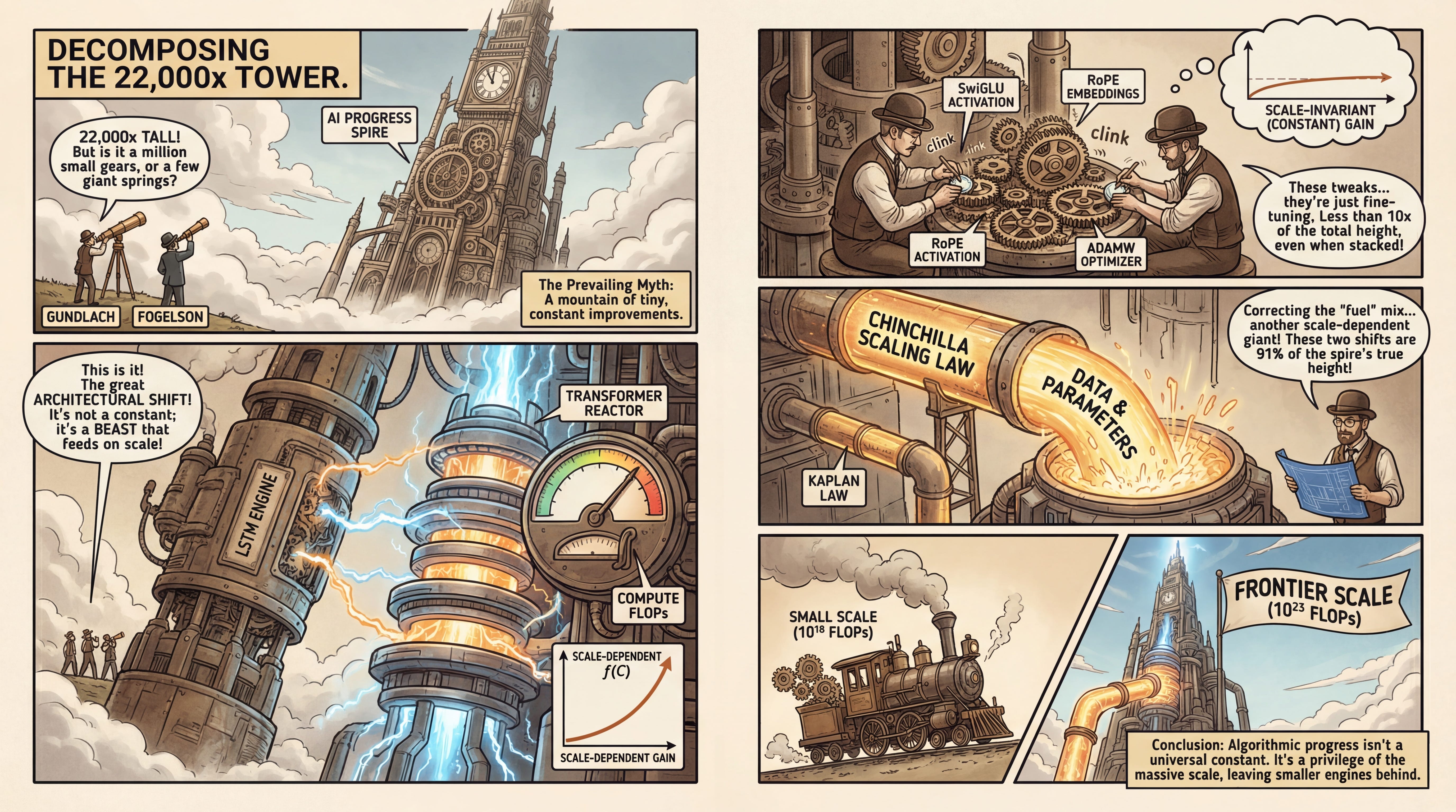 WHAT was done? The authors deconstruct the widely cited estimate that algorithmic efficiency increased by roughly 22,000× between 2012 and 2023. By conducting ablation studies on modern Transformers (reverting components like SwiGLU and Rotary Embeddings) and performing scaling experiments against LSTMs, they determine that the vast majority of “progress” is not the sum of many small improvements. Instead, 91% of extrapolated gains at the frontier (1023 FLOPs) stem from two specific, scale-dependent shifts: the architectural transition from LSTMs to Transformers and the optimization shift from Kaplan to Chinchilla scaling laws.