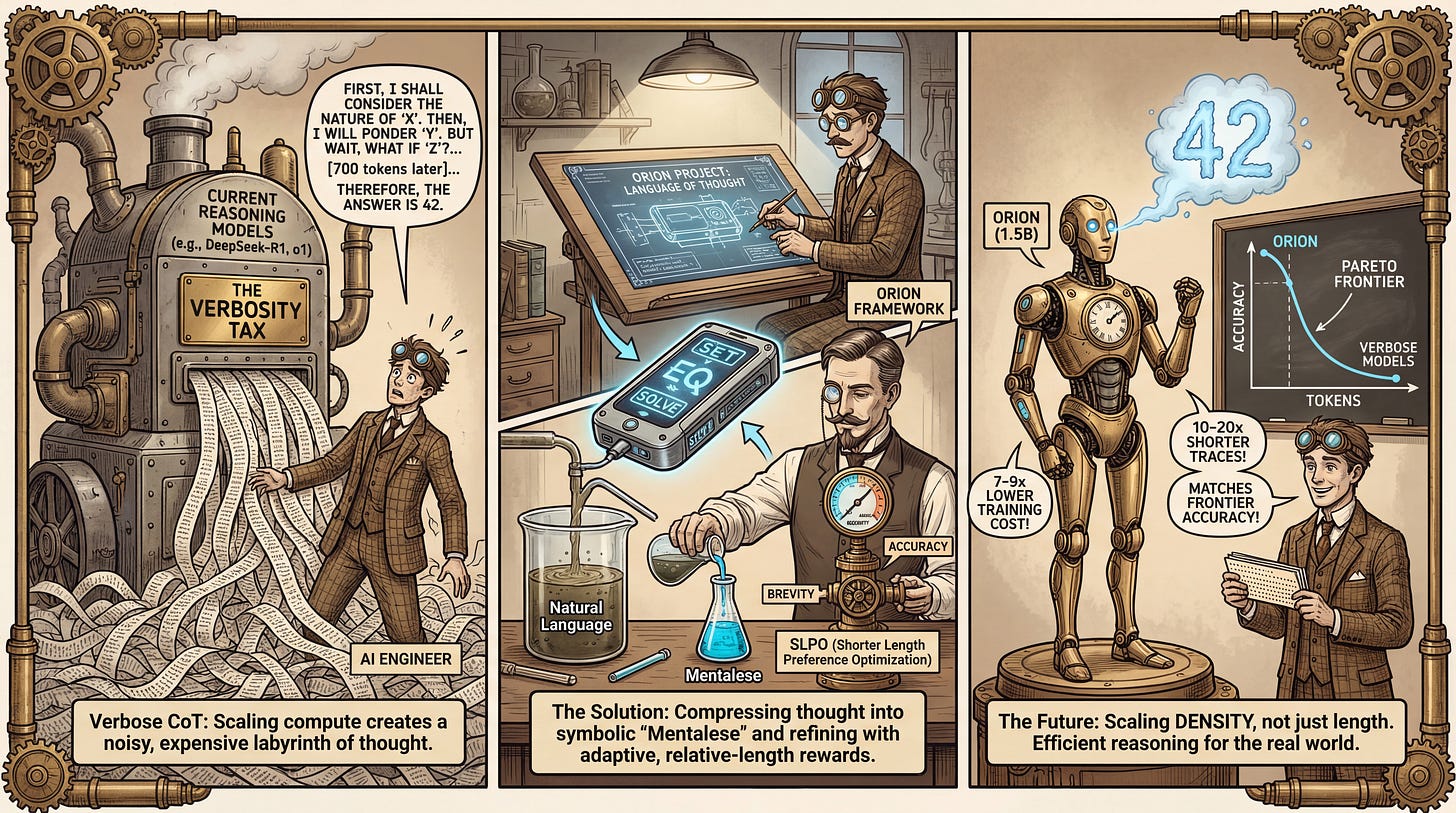WHAT was done? The authors introduce ORION, a framework that compresses the reasoning traces of Large Reasoning Models (LRMs) by aligning them to a symbolic “Language of Thought” called Mentalese. They achieve this via a two-stage process: Supervised Fine-Tuning (SFT) on a new dataset of 40k compressed reasoning traces, followed by a novel reinforcement learning objective called Shorter Length Preference Optimization (SLPO), which dynamically rewards brevity without sacrificing accuracy.