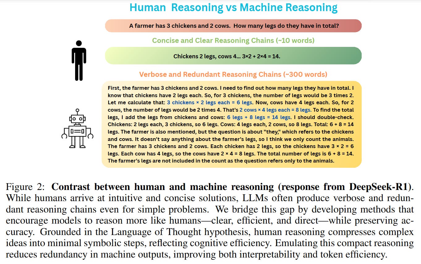 The current paradigm in Large Reasoning Models (LRMs) is dominated by the “scaling test-time compute” approach. Models like DeepSeek-R1 and OpenAI’s o1 series generate extensive Chain-of-Thought (CoT) traces to break down complex problems. While effective, this introduces a significant “verbosity tax.” As illustrated in Figure 2, a model might generate hundreds of tokens of redundant natural language just to solve a simple arithmetic problem, whereas a human cognitive process is likely far more compressed and symbolic.