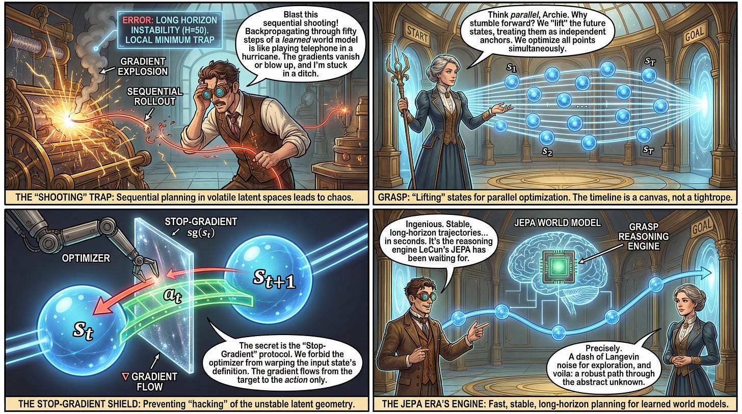 WHY it matters? This work appears to be the “reasoning engine” counterpart to Yann LeCun’s Joint Embedding Predictive Architecture (JEPA). While recent work has focused on training world models (V-JEPA, I-JEPA — see review here), effective planning within those non-Euclidean latent spaces has remained brittle due to exploding gradients and local minima. GRASP solves this by decoupling temporal dependencies, offering a robust way to perform long-horizon control in the high-dimensional latent spaces envisioned by the “Autonomous Machine Intelligence” roadmap.