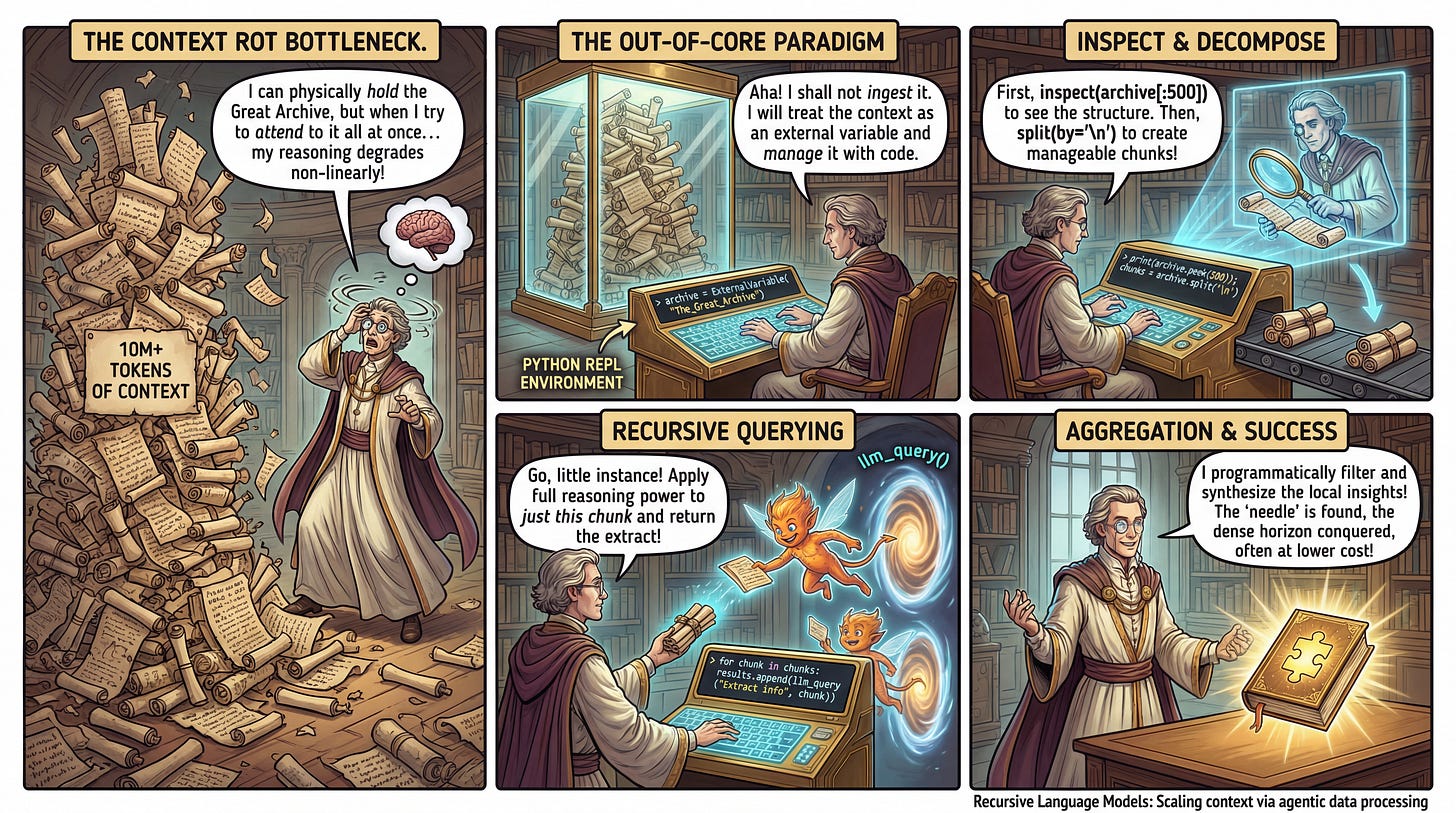 Current mitigation strategies typically fall into two buckets: architectural optimizations (e.g., sparse attention) or compression heuristics (e.g., RAG, summarization loops). However, these methods often fail on “needle-in-a-haystack” retrieval or complex aggregation tasks like BrowseComp-Plus because they lossily compress the input before the model can reason about what is relevant. The authors of this paper operate on a different intuition: inspired by out-of-core algorithms in database systems—where datasets larger than RAM are processed by paging data in and out—they propose moving the context out of the neural network’s immediate memory and into an interactive, symbolic environment.