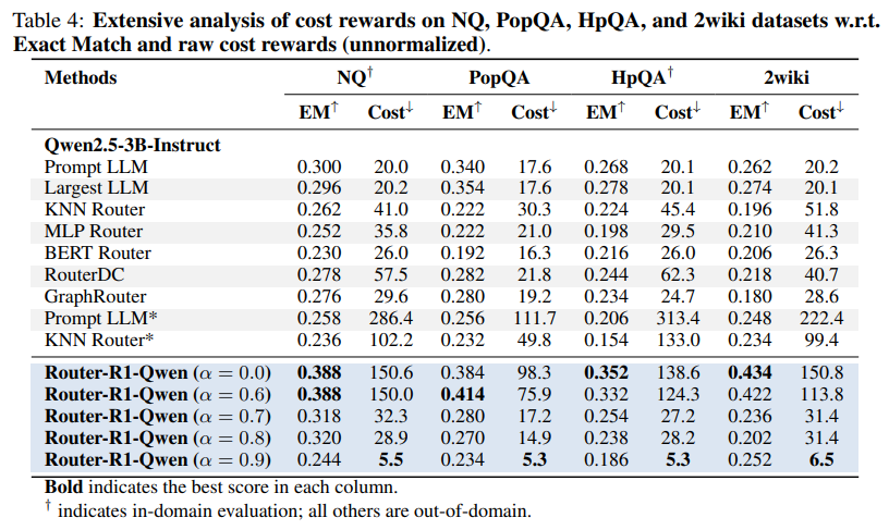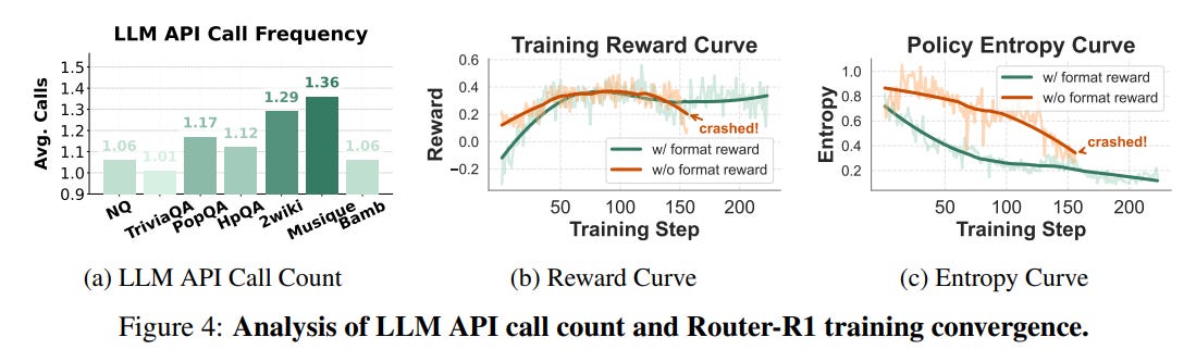 Cost-Aware Routing: The analysis of the cost reward reveals an emergent, intelligent routing strategy. When faced with a task, Router-R1 learns to first query smaller, more cost-effective models. It only escalates to larger, more expensive models if the initial attempts fail to yield a satisfactory answer (Figure 3, Table 4). This dynamic balancing act makes the system highly practical for real-world deployments where budget constraints are a major concern.