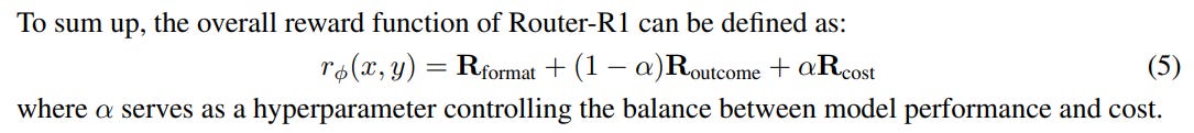To teach the router this complex behavior, the authors employ reinforcement learning (RL), a well-suited choice for optimizing the inherently non-differentiable decisions of which model to call at each step. The learning is guided by a simple yet highly effective rule-based reward function (Equation 5) whose true cleverness lies in its hierarchical structure. It is composed of three key elements:
