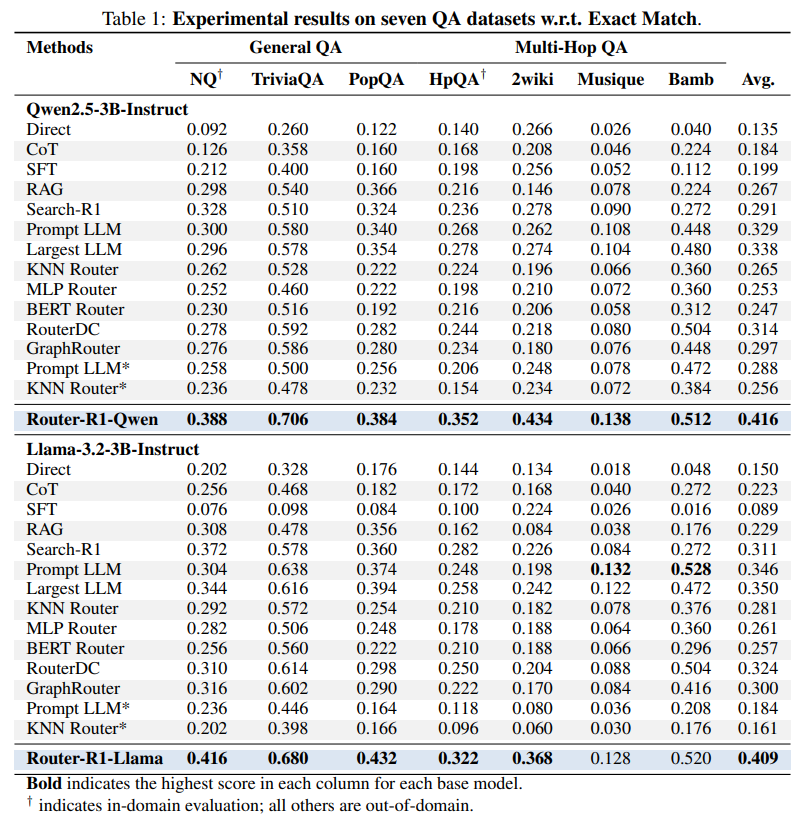 Superior Performance: Router-R1 consistently outperforms a wide range of baselines, including direct inference, Chain-of-Thought (https://arxiv.org/abs/2201.11903), RAG, and numerous single-shot LLM routers like GraphRouter (https://arxiv.org/abs/2410.03834) and RouterDC (https://arxiv.org/abs/2409.19886). For instance, the Router-R1-Qwen model achieved an average Exact Match score of 0.416, significantly higher than its competitors (Table 1). While the performance gains are impressive, the paper does not provide statistical significance tests or error bars, which would further strengthen these quantitative claims.