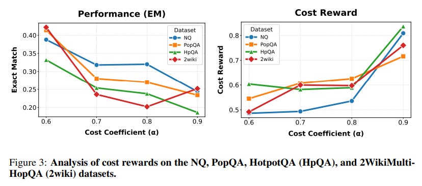format. The authors implement a priority system: a negative reward for malformed output immediately zeroes out the other rewards for that step. This simple but critical design choice forces the model to first learn the correct action structure before it can optimize for correctness or cost, effectively stabilizing the entire learning process (Figure 4).Outcome Reward: A standard reward based on the final answer's correctness, using Exact Match (EM) to guide the model toward accurate solutions.