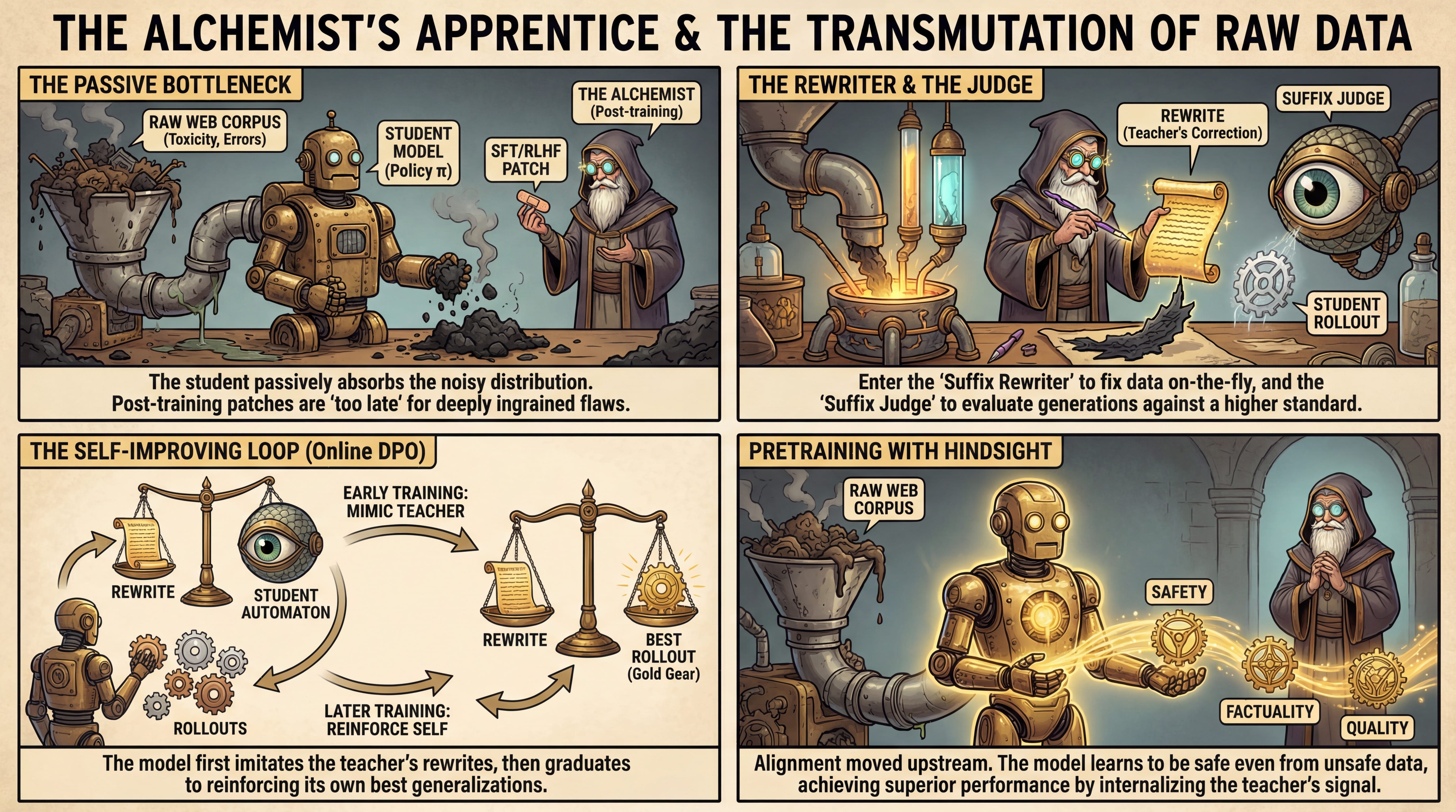 The current paradigm of Large Language Model (LLM) training relies heavily on a two-stage process: massive self-supervised pretraining on raw web data followed by fine-tuning (SFT and RLHF) for alignment. The fundamental bottleneck here is that pretraining is passive; the model indiscriminately absorbs the distribution of the internet, including toxicity, bias, and factual errors. While post-training attempts to suppress these behaviors, it often acts as a superficial patch over deeply ingrained patterns. The authors of this paper argue that addressing these issues during post-training is “too late.” If a model learns that “The Earth is flat” is a plausible continuation of a specific context during pretraining, unlearning that association requires fighting the model’s core weights. This paper proposes moving the alignment signal upstream, effectively cleaning the data and the model’s behavior simultaneously during the compute-heavy pretraining phase.