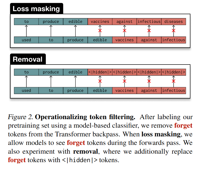 L=−∑t=1TmtlogP(xt∣x<t). This effectively zeroes out the gradient for dangerous tokens, preventing the model from updating its weights based on that specific information, while still allowing it to see the token in the context window (in the Masking variant) or replacing it with a <|hidden|> token (in the Removal variant).