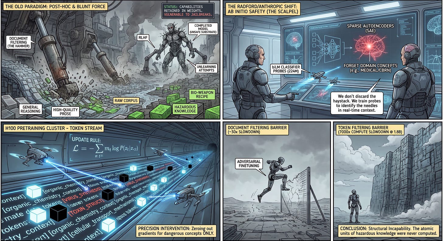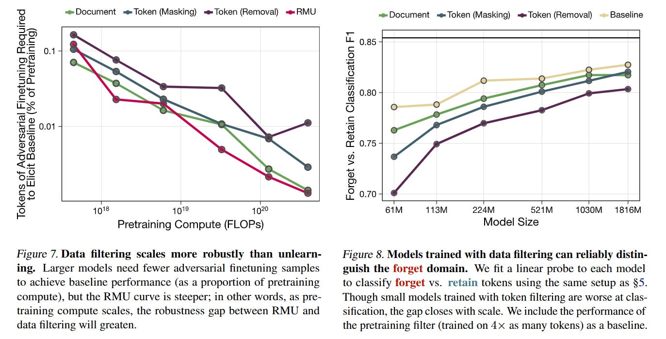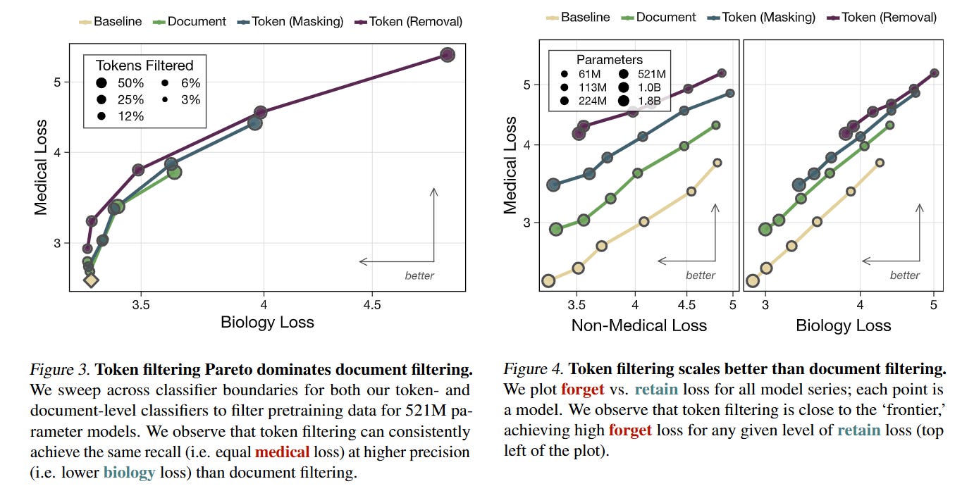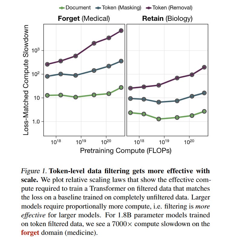 WHY it matters? This represents a shift from “post-hoc” safety (RLHF/Unlearning) to “ab initio” safety. The results are striking: token filtering scales significantly better than document-level filtering, creating a 7000× compute slowdown for the model to re-acquire the forgotten knowledge at the 1.8B parameter scale. Furthermore, the paper features Alec Radford (lead author of GPT-2 and GPT-3) as an independent author alongside Anthropic researchers, signaling a high-profile convergence on data curation as a primary safety lever.