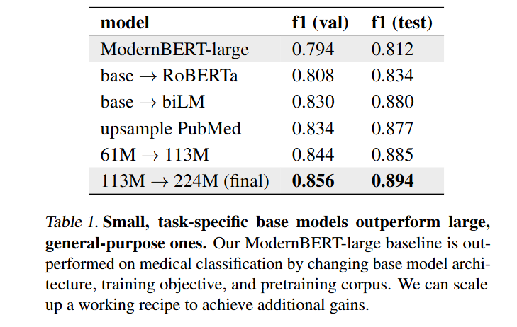The engineering choices behind the classifier deserve attention for practitioners. The authors found that small, task-specific bidirectional models significantly outperform larger, general-purpose causal models for this tagging task. A 224M parameter biLM achieved an F1 score of 0.894 on token classification, beating a ModernBERT-large baseline.