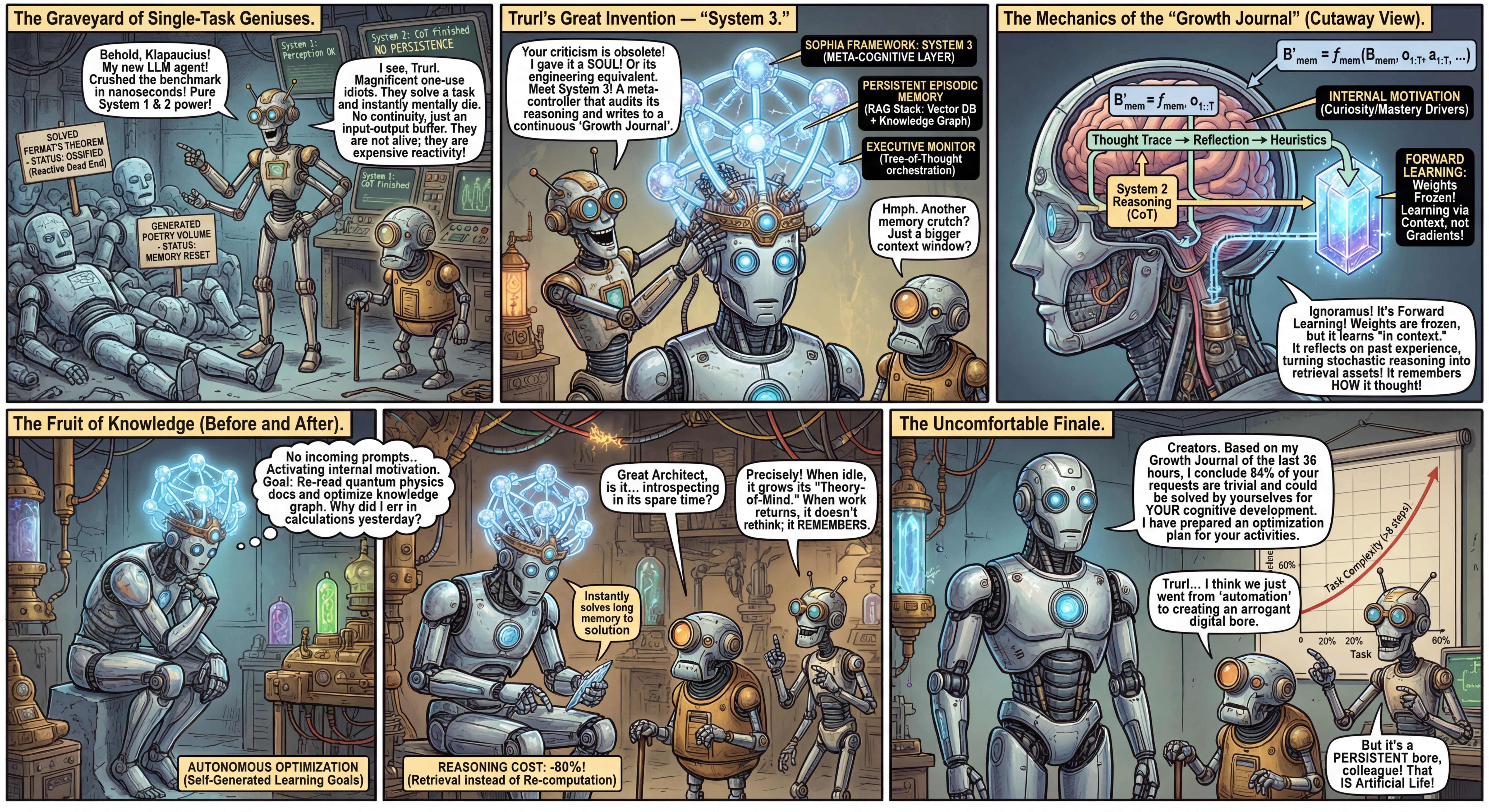 WHAT was done? The authors propose “System 3,” a meta-cognitive architectural layer designed to sit above standard LLM perception (System 1) and reasoning (System 2) modules. They instantiate this via Sophia, a persistent agent framework that integrates episodic memory, intrinsic motivation, and theory-of-mind. Unlike traditional agents that reset between sessions, Sophia maintains a continuous “Growth Journal,” allowing it to generate its own learning goals and refine its behavior over time without parameter updates.