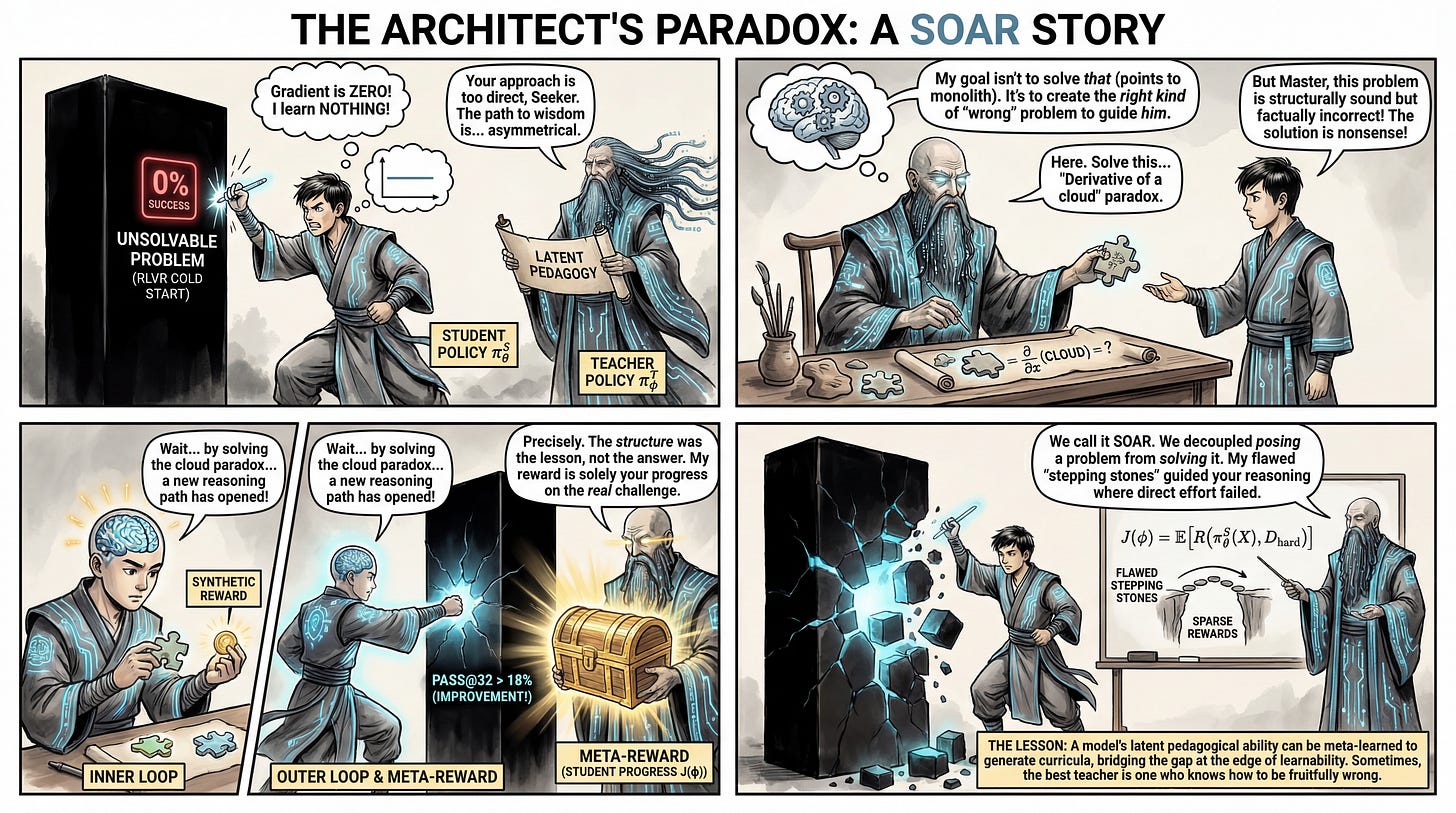 WHY it matters? This approach effectively solves the “cold start” problem in Reinforcement Learning with Verifiable Rewards (RLVR). When a model cannot solve a single instance of a hard dataset (0% success rate), standard RL fails due to a lack of gradient signal. SOAR demonstrates that models possess a latent “pedagogical” capability—distinct from problem-solving—that can be sharpened via meta-RL to generate useful “stepping stone” curricula, enabling the student to solve problems that were previously out of reach without human-curated data.