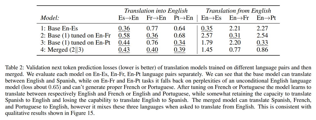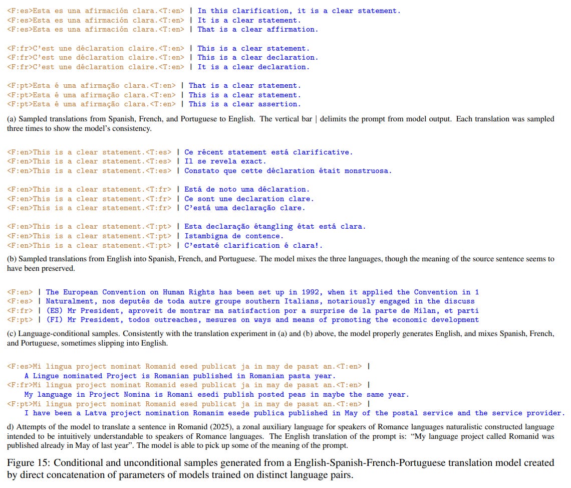 While the merged model shows some “human-like degradation” in generation without fine-tuning (Figure 15), it successfully retains knowledge from both parent models, showcasing a promising path toward treating LLMs as composable computer programs.