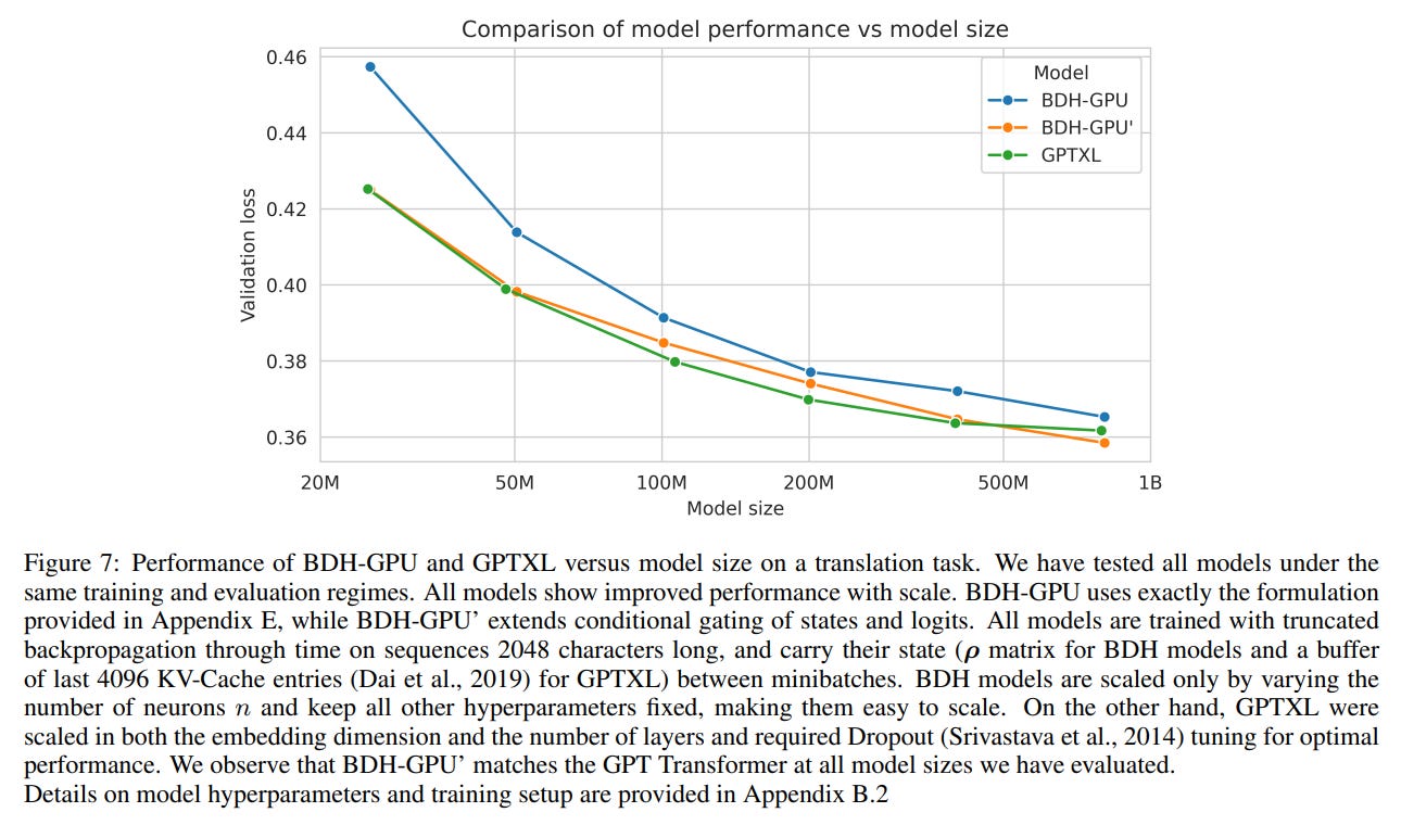 Performance and Scaling: Experiments show that BDH-GPU follows Transformer-like scaling laws. A variant (BDH-GPU’) matches the performance of a GPT-2 style baseline that uses state management from Transformer-XL on translation tasks at scales from 10M to 1B parameters (Figure 7).