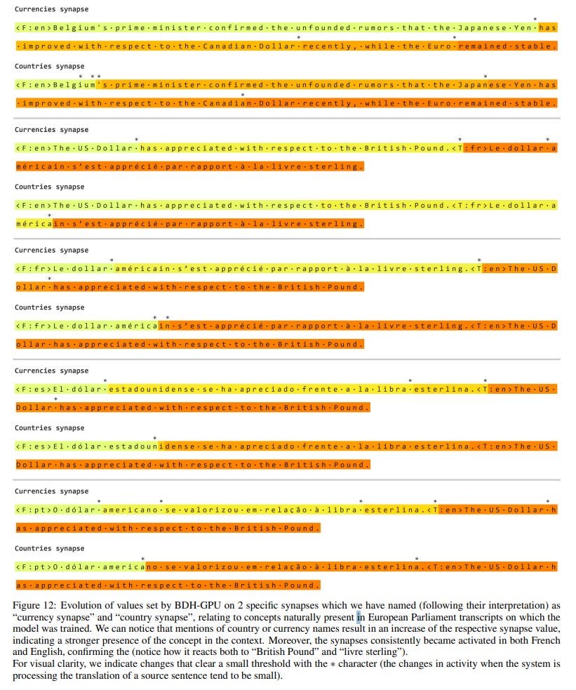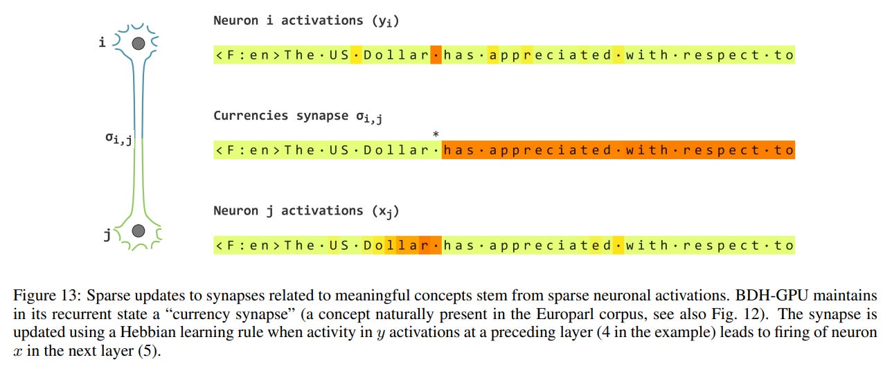 Monosemantic Synapses: By tracking the state matrix σ (recovered from ρ), the authors identify individual synapses (neuron-neuron links) that consistently activate when processing specific abstract concepts, such as “currency” or “country name,” across different languages (Figure 12).