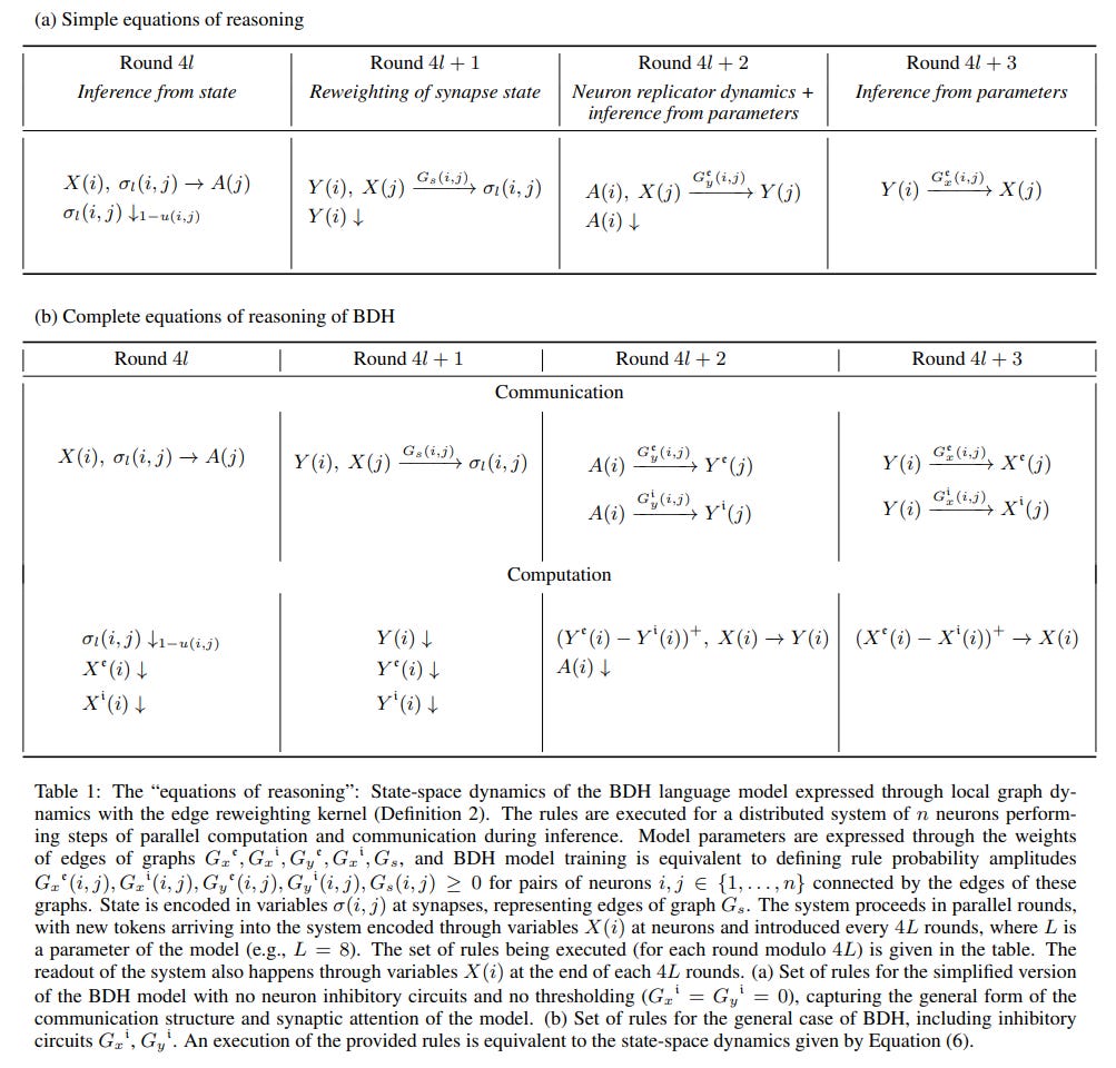 The core theoretical contribution is the Dragon Hatchling (BDH) architecture, a system of n interacting neuron particles whose inference is defined not by global matrix multiplications but by local graph dynamics. The authors formalize this with an edge-reweighting kernel, a set of rules they term the “equations of reasoning” (Table 1).