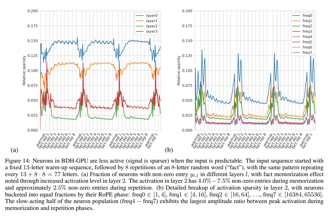 Sparse Positive Activations: Neuron activations are positive and highly sparse. The level of sparsity correlates with input predictability, with fewer neurons firing for expected inputs, suggesting an inherent adaptive computation mechanism (Figure 14).