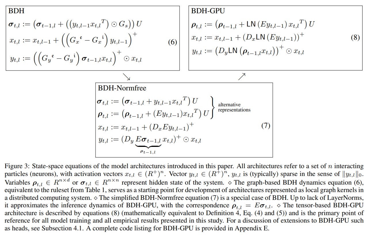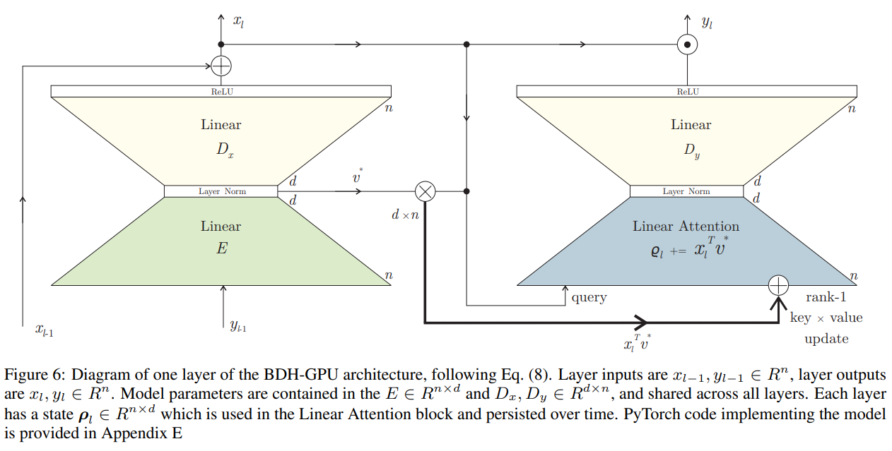 The BDH-GPU architecture (Figure 6) is governed by a layer-recurrent state-space equation and relies on two key components that operate in the high neuronal dimension n: