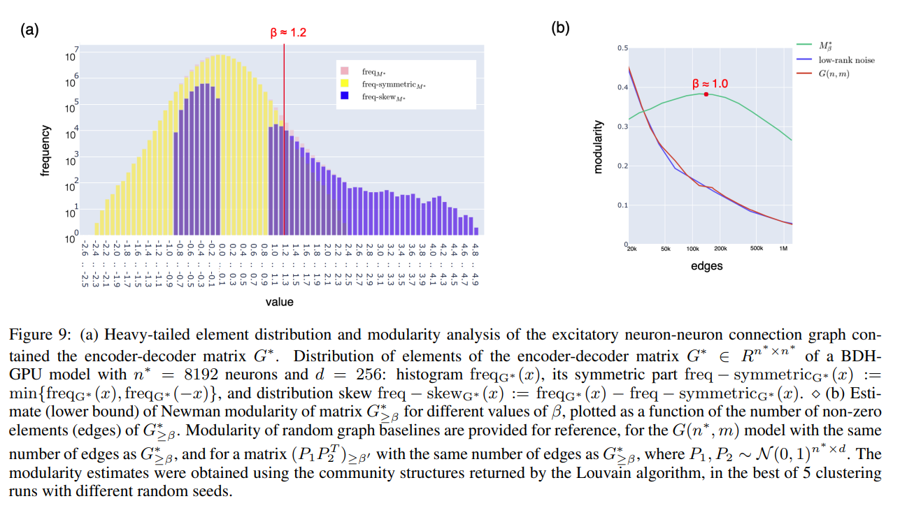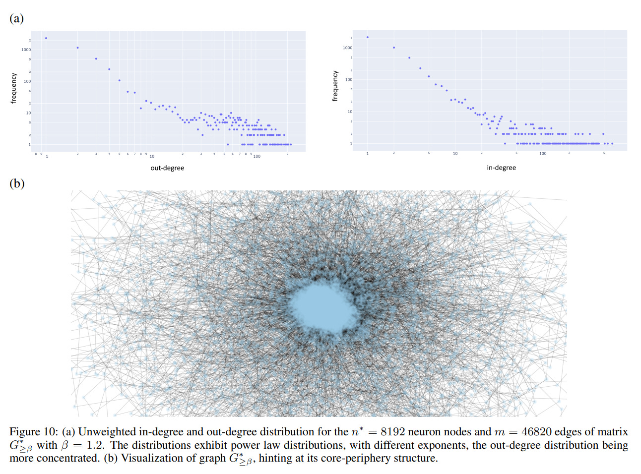 Analysis reveals heavy-tailed, power-law-like degree distributions (Figure 10) and high Newman modularity (Figure 9), properties associated with efficient information processing in complex natural systems. This structure is not imposed but emerges as an optimal solution for the learning task.