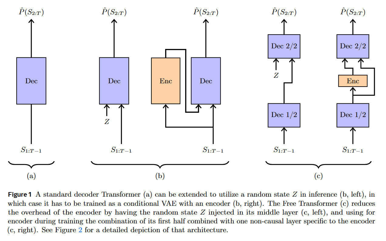 WHAT was done? The paper introduces the “Free Transformer,” an extension of the standard decoder-only Transformer that conditions its generative process on random latent variables. This is achieved by reformulating the architecture as a Conditional Variational Autoencoder (CVAE). The key innovation is an exceptionally efficient design where the latent variable is injected into the decoder’s middle layer, allowing the encoder and decoder to share the first half of the Transformer blocks. This adds only one extra non-causal Transformer block and results in a minimal computational overhead of just 3-4%.