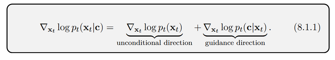 Controllable Generation via Guidance Guidance techniques are elegantly explained through the Bayesian decomposition of the conditional score (Equation 8.1.1).