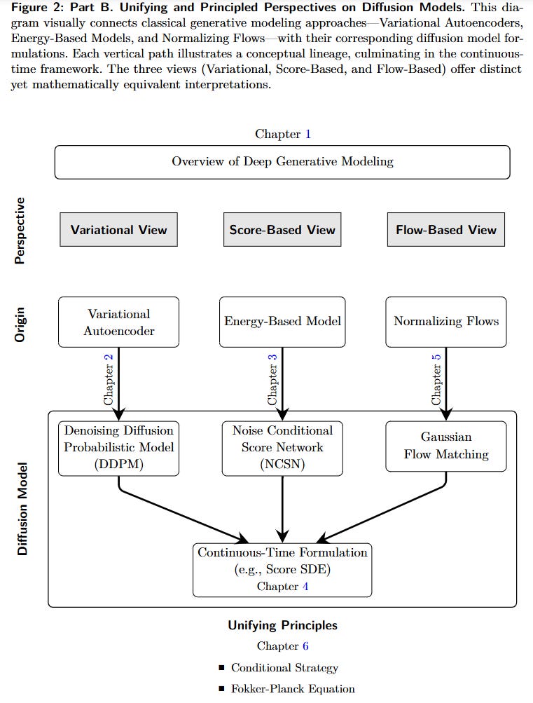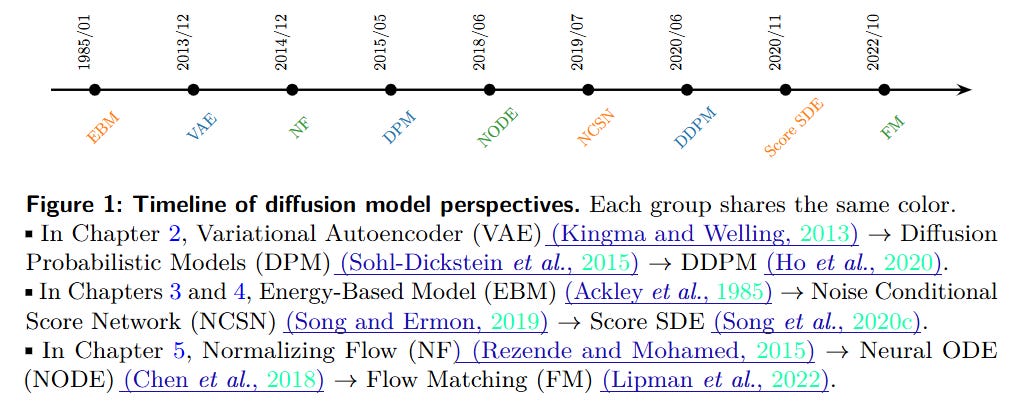 The monograph begins by outlining the three foundational perspectives on diffusion models, each originating from a classic generative modeling paradigm (Figure 2):