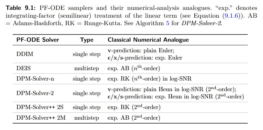 Training-Free Acceleration (Improving the Solver): This approach treats the trained diffusion model as a fixed vector field and focuses on developing better numerical ODE solvers. The monograph details the evolution from DDIM (an exponential-Euler method) to higher-order solvers like DEIS (Zhang and Chen, 2022, https://arxiv.org/abs/2204.13902) and the DPM-Solver family (Lu et al., 2022b, https://arxiv.org/abs/2206.00927), which achieve massive speedups by leveraging the semi-linear structure of the PF-ODE and a clever log-SNR time reparameterization (Table 9.1).