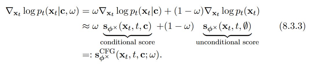 Classifier-Free Guidance (CFG), for instance, models the conditional score as a linear combination of the unconditional and conditional scores: