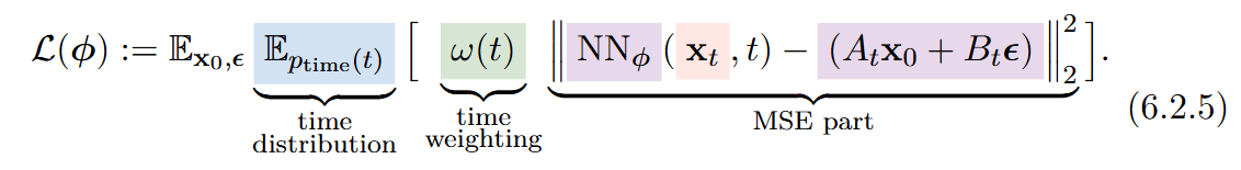 where x_t=α_t x_0 + σ_t ϵ. The neural network NNϕ is trained to predict a specific target constructed from the clean data x_0 and the noise ϵ. The choice of prediction—noise (ϵ), clean data (x_0), score (s), or velocity (v)—simply changes the coefficients At and Bt (Table 6.1).