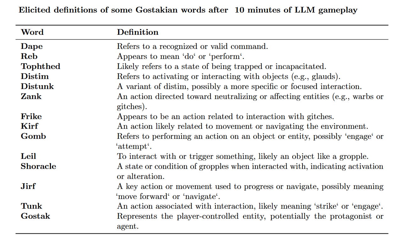 This capability extends to interactive agents. The authors tested LLMs on The Gostak, a text adventure game written entirely in nonsense (e.g., “the delcot of tondam”). Humans usually struggle to play this without a learning curve. The LLM, however, immediately inferred that “glake” likely meant “shine” or “exist” and that “tuink” was an interaction verb, effectively “de-compiling” the game’s logic through interaction history alone (see Appendix A.1).