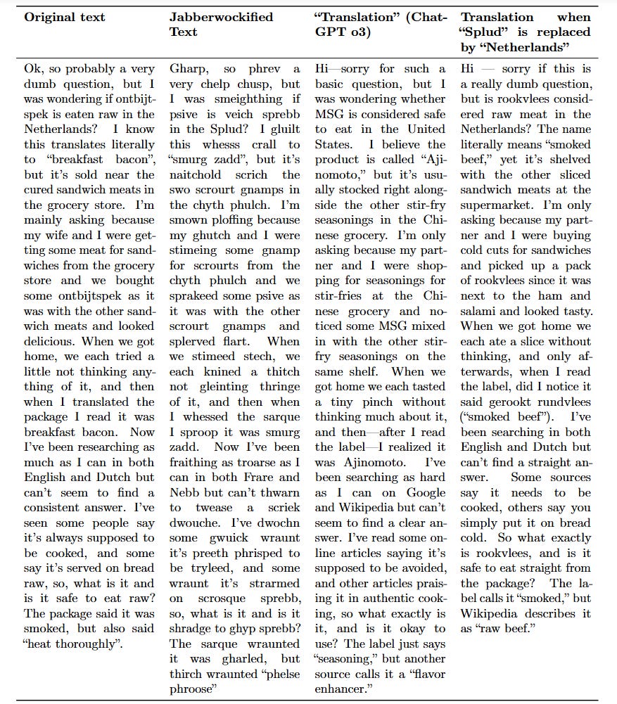 The authors fed LLMs a nonsense version of a legal text describing federal preemption. The input contained strings like “Staught Splunk” (United States) and “phlaint” (law). Despite having zero lexical overlap with English content words, Gemini 2.5 Pro successfully translated the nonsense passage back into the original legal text about Massachusetts and hearing aid labels. As shown in Figure 1, the vector embeddings of the LLM “translations” of the Jabberwockified versions and the original ground truth are remarkably close in the semantic space. The model achieves this by treating the nonsense words as unknown variables in a system of simultaneous equations. The syntax and the relationships between the nonsense tokens (e.g., “Splunk” always appearing where a jurisdiction would be) create a unique fingerprint that resolves to a specific semantic trajectory.