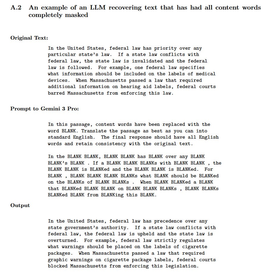 Crucially, the authors note a distinction in model capability. While Gemini 2.5 Pro handled the standard “Jabberwocky” texts, Appendix A.2 demonstrates a more extreme test using Gemini 3 Pro. In this experiment, every content word was replaced not with unique nonsense strings, but with the uniform token “BLANK.” Even with this extreme information loss, the more advanced model successfully reconstructed a passage about federal law, suggesting that as models scale, their ability to “de-blur” based on pure syntax becomes increasingly robust.