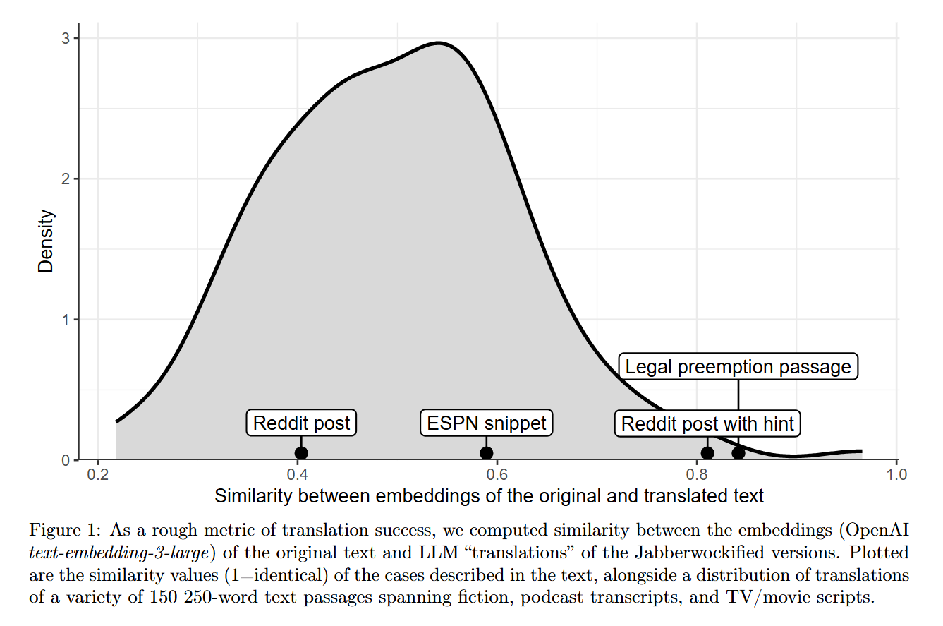 To ensure the models were not simply reciting training data, the authors employed strict controls. They used Figure 1 to quantify the similarity between the embeddings (via OpenAI’s text-embedding-3-large) of the original text and the model’s translation. The density plot confirms that while some translations drift, a significant portion effectively recovers the original semantic vector.